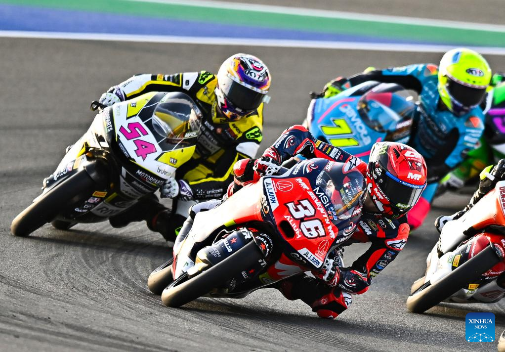 Spanish moto3 rider Angel Piqueras (front) of Frinsa - MT Helmets - MSI steers during the Moto3 final race of MotoGP Grand Prix Qatar 2025 in Lusail Circuit in Doha, Qatar, on April 13, 2025. (Photo by Nikku/Xinhua)