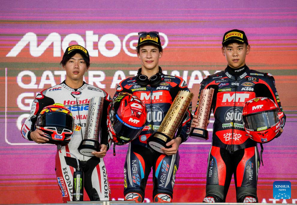 First placed Spanish moto3 rider Angel Piqueras (C) of Frinsa - MT Helmets - MSI, Second placed Japanese Moto3 rider Taiyo Furusato (L) of Honda Team Asia and third placed Japanese Moto3 rider Ryusei Yamanaka (R) of Frinsa - MT Helmets - MSI celebrates on the podium after Moto3 race of the MotoGP Grand Prix Qatar 2025 in Lusail Circuit in Doha, Qatar, on April 13, 2025. (Photo by Nikku/Xinhua)