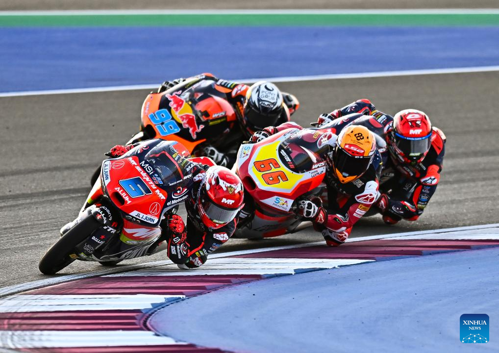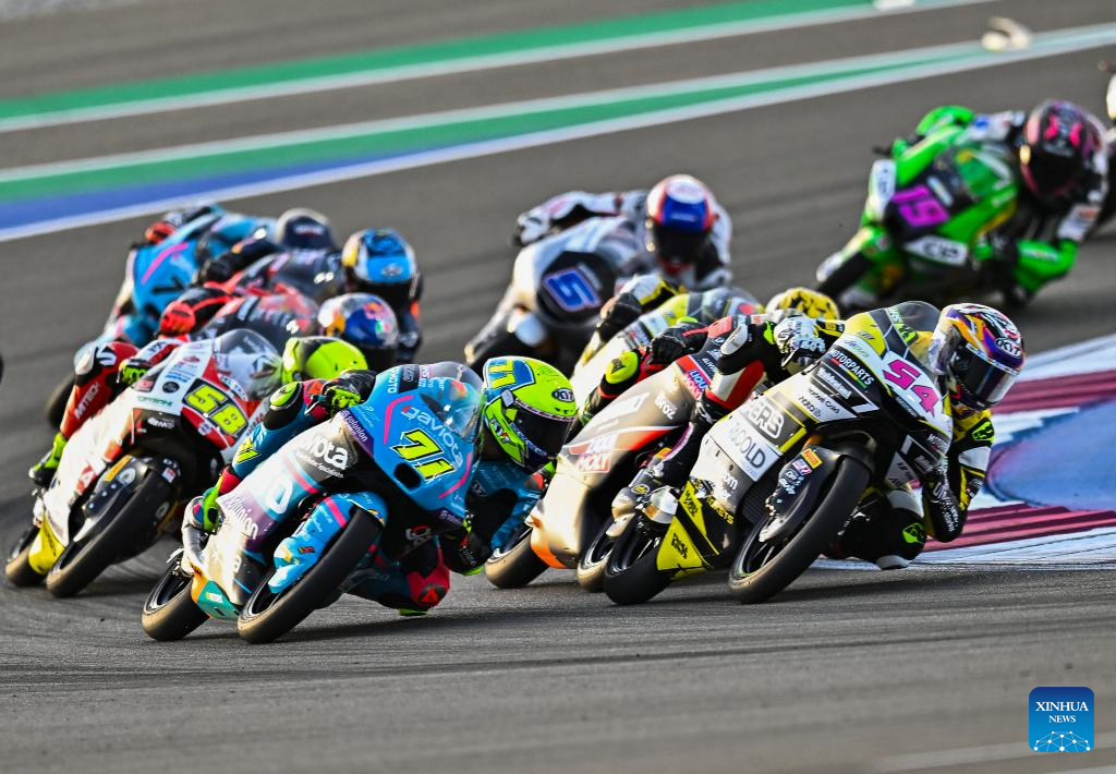 Italian moto3 rider Riccardo Rossi (1st R) of Rivacold Snipers Team steers during the Moto3 final race of MotoGP Grand Prix Qatar 2025 in Lusail Circuit in Doha, Qatar, on April 13, 2025. (Photo by Nikku/Xinhua)