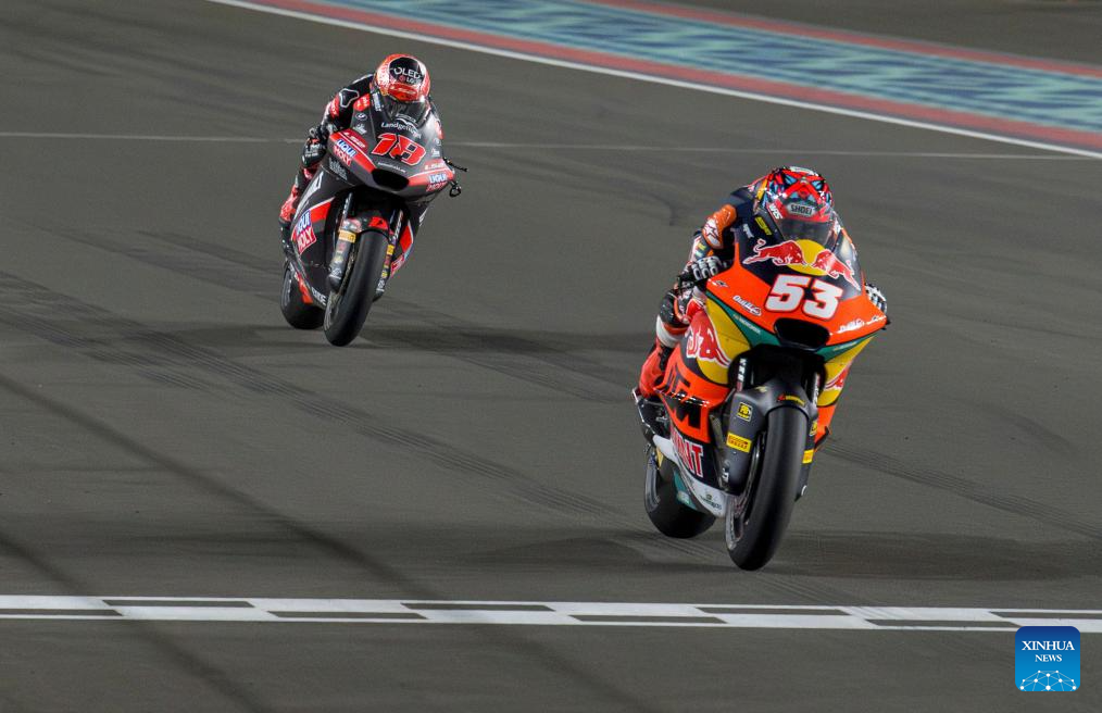 Turkish Moto2 rider Deniz Oncu (R) of Red Bull KTM Ajo and Spanish Motot2 rider Manuel Gonzalez of Liqui Moly Dynavolt Intact GP steers during the Moto2 final race of MotoGP Grand Prix Qatar 2025 in Lusail Circuit in Doha, Qatar, on April 13, 2025. (Photo by Nikku/Xinhua)