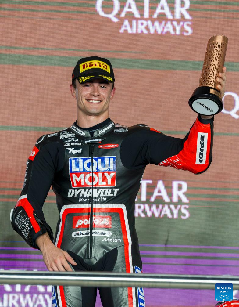 Spanish Moto2 rider Manuel Gonzalez of Liqui Moly Dynavolt Intact GP celebrates on the podium after winning the third place in the Moto2 race of MotoGP Grand Prix Qatar 2025 in Lusail Circuit in Doha, Qatar, on April 13, 2025. (Photo by Nikku/Xinhua)