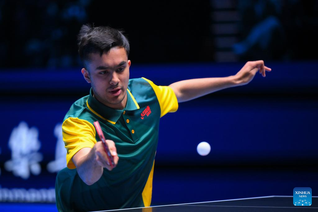 Aditya Sareen of Australia hits a return during the men's singles group match between Wang Chuqin of China and Aditya Sareen of Australia at the ITTF Men's and Women's World Cup 2025 in Macao, China, April 15, 2025. (Xinhua/Chen Duo)