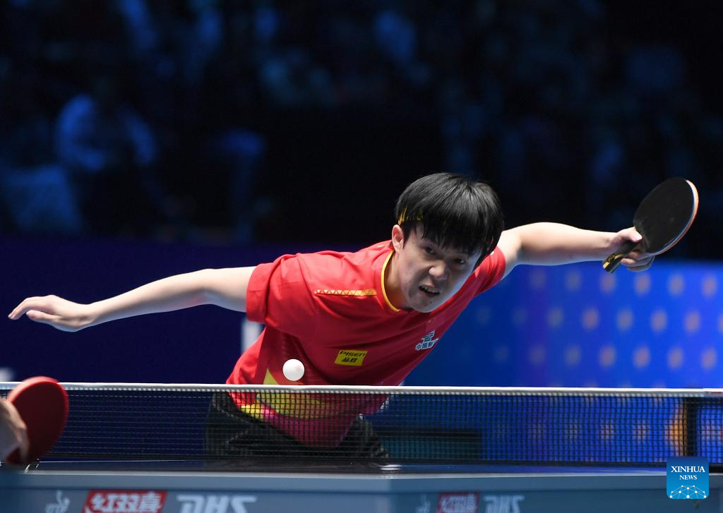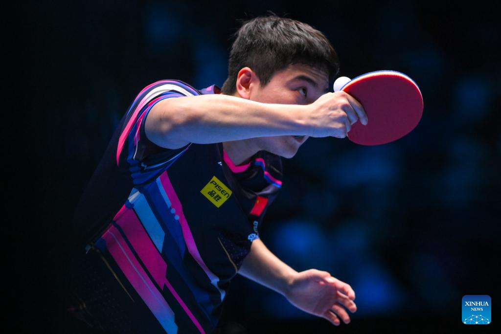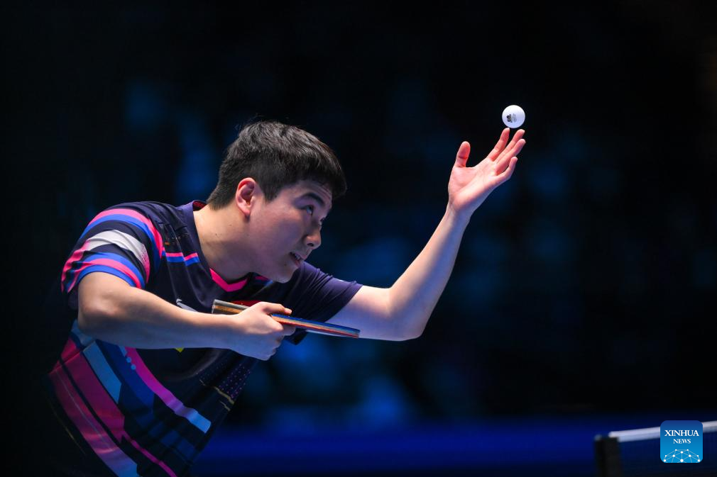 Wang Chuqin of China hits a return during the men's singles group match between Wang Chuqin of China and Aditya Sareen of Australia at the ITTF Men's and Women's World Cup 2025 in Macao, China, April 15, 2025. (Xinhua/Chen Duo)