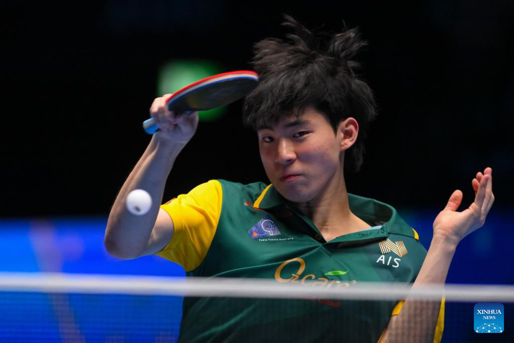 Bae Hwan hits a return during the men's singles group match between Lin Shidong of China and Bae Hwan of Australia at the ITTF Men's and Women's World Cup 2025 in Macao, China, April 15, 2025. (Xinhua/Cheong Kam Ka)