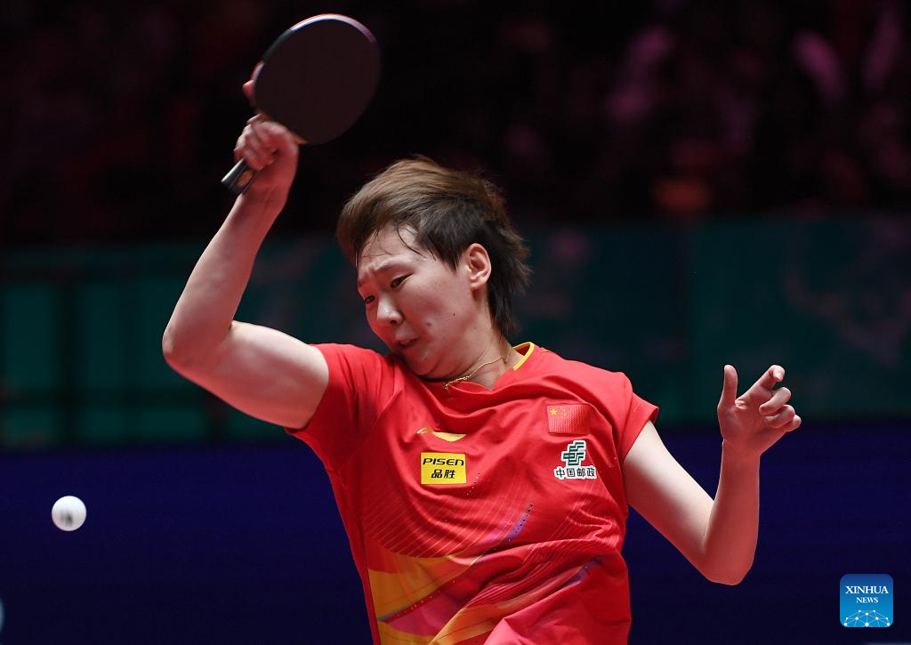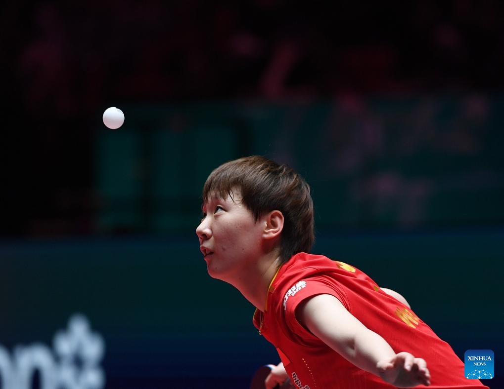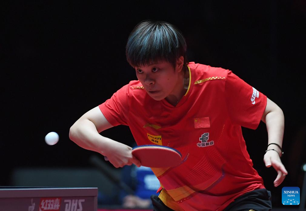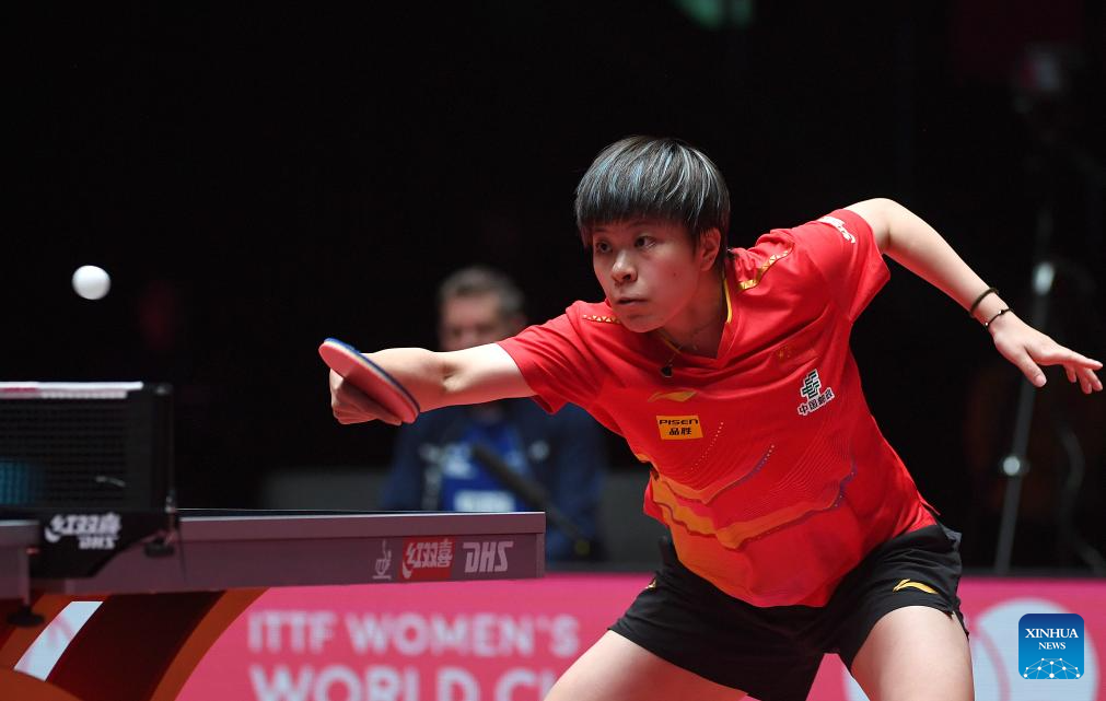 Wang Manyu hits a return during the women's singles group match between Wang Manyu of China and Linda Bergstrom of Sweden at the ITTF Men's and Women's World Cup 2025 in Macao, China, April 15, 2025. (Xinhua/Chen Duo)