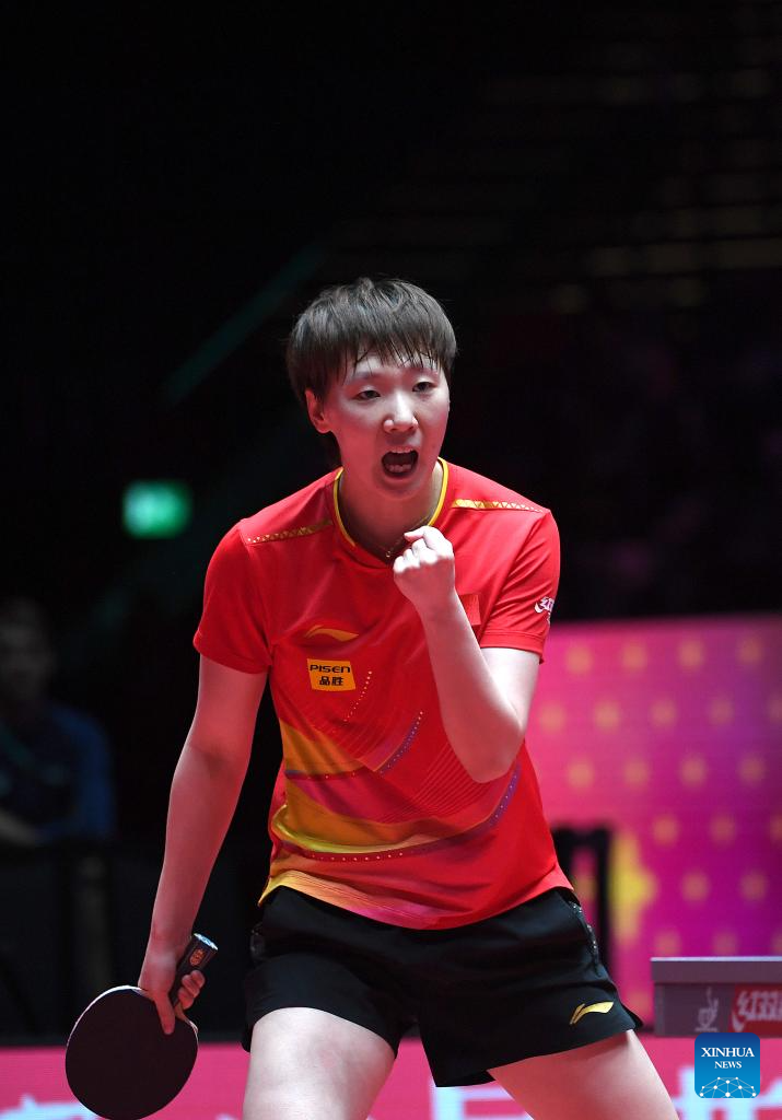 Wang Manyu celebrates after scoring during the women's singles group match between Wang Manyu of China and Linda Bergstrom of Sweden at the ITTF Men's and Women's World Cup 2025 in Macao, China, April 15, 2025. (Xinhua/Chen Duo)