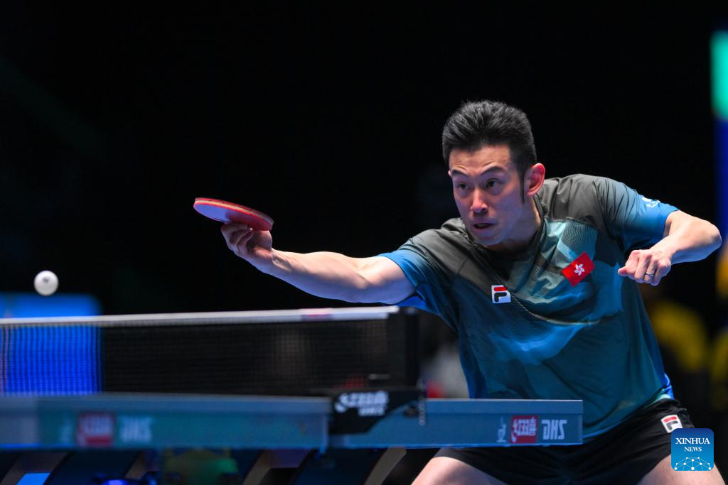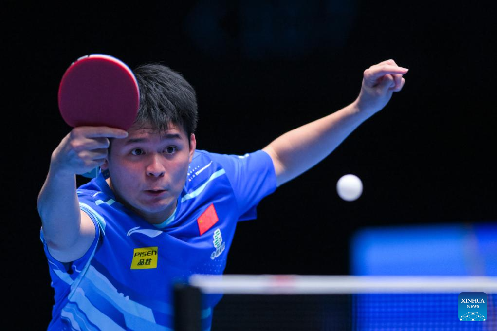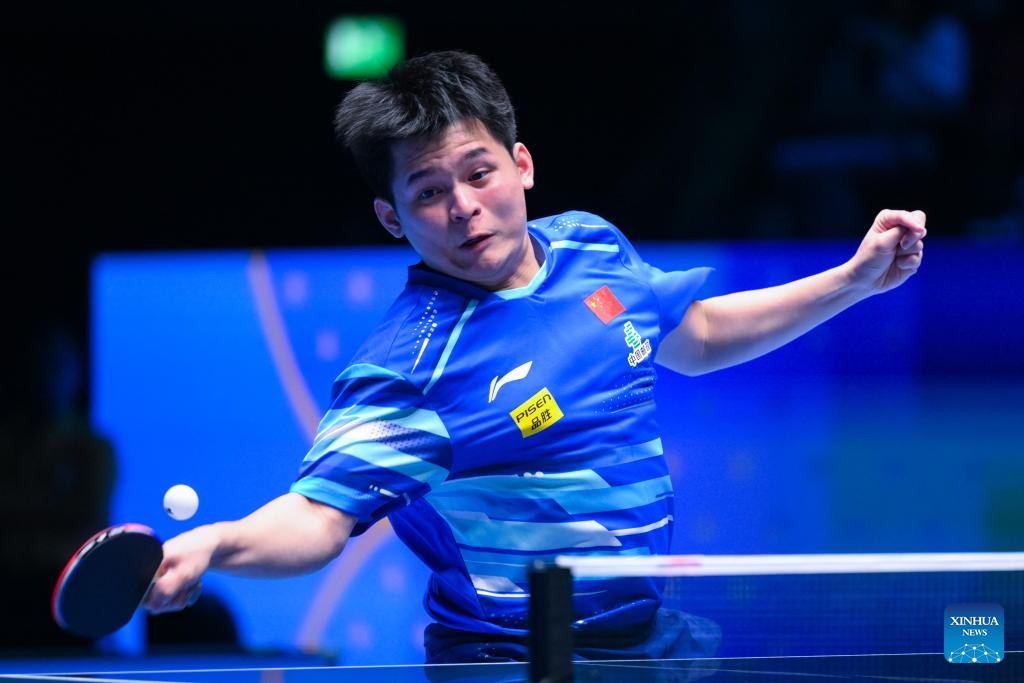 Lin Shidong hits a return during the men's singles group match between Lin Shidong of China and Bae Hwan of Australia at the ITTF Men's and Women's World Cup 2025 in Macao, China, April 15, 2025. (Xinhua/Cheong Kam Ka)