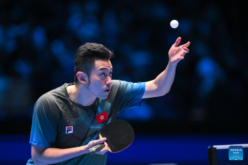 Wong Chun Ting hits a return during the men's singles group match between Liang Jingkun of China and Wong Chun Ting of China's Hong Kong at the ITTF Men's and Women's World Cup 2025 in Macao, China, April 15, 2025. (Xinhua/Cheong Kam Ka)