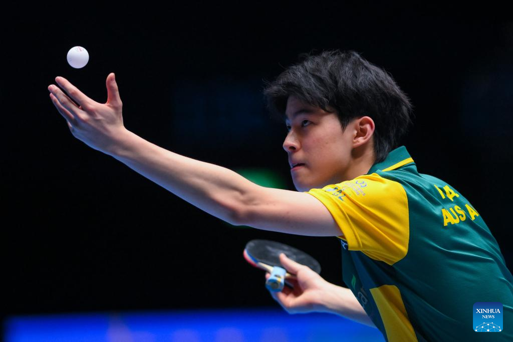 Aditya Sareen of Australia hits a return during the men's singles group match between Wang Chuqin of China and Aditya Sareen of Australia at the ITTF Men's and Women's World Cup 2025 in Macao, China, April 15, 2025. (Photo by Cheong Kam Ka/Xinhua)