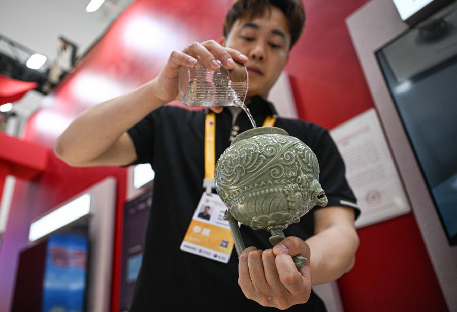 An exhibitor demonstrates Xiang embroidery, a national intangible cultural heritage, at the 5th China International Consumer Products Expo (CICPE) in Haikou, south China's Hainan Province, April 15, 2025. (Xinhua/Zhang Liyun)An inheritor of intangible cultural heritage demonstrates Dongyang Wood Carving, a national intangible cultural heritage, at the 5th China International Consumer Products Expo (CICPE) in Haikou, south China's Hainan Province, April 15, 2025. (Xinhua/Zhang Liyun)People select products of Xilankapu brocade, a national intangible cultural heritage, at the 5th China International Consumer Products Expo (CICPE) in Haikou, south China's Hainan Province, April 15, 2025. (Xinhua/Guo Cheng)Qiong opera actors interact with visitors at the 5th China International Consumer Products Expo (CICPE) in Haikou, south China's Hainan Province, April 13, 2025. (Xinhua/Guo Cheng)An exhibitor displays a product of Yaozhou kiln ceramics at the 5th China International Consumer Products Expo (CICPE) in Haikou, south China's Hainan Province, April 15, 2025. (Xinhua/Pu Xiaoxu)People selects products of Lihou Tiger, a national intangible cultural heritage of north China's Shanxi Province, at the 5th China International Consumer Products Expo (CICPE) in Haikou, south China's Hainan Province, April 15, 2025. (Xinhua/Sun Xiaotian)Li brocade handbags are pictured at the Hainan Pavilion at the 5th China International Consumer Products Expo (CICPE) in Haikou, south China's Hainan Province, April 15, 2025. (Xinhua/Pu Xiaoxu)■