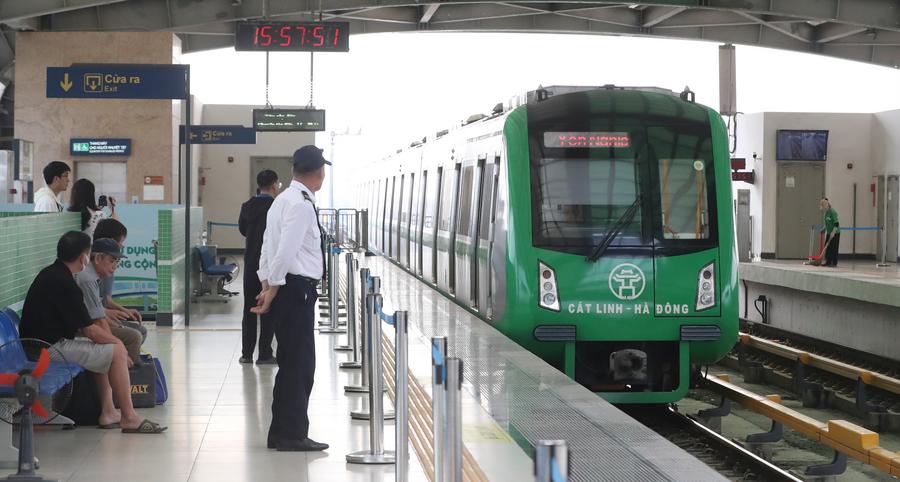 Citizens prepare to take a train of the Cat Linh-Ha Dong urban elevated railway in Hanoi, Vietnam, Oct. 9, 2024. The Cat Linh-Ha Dong urban elevated railway was built by the China Railway Sixth Group as an important project of the synergy of the China-proposed Belt and Road Initiative with Vietnam's "Two Corridors and One Economic Circle" plan. (Xinhua/Yao Qilin)