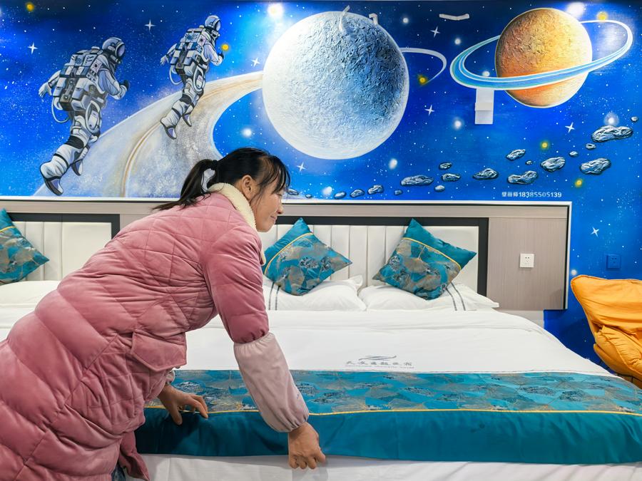 A woman tidies up a room in a sci-fi style homestay in Kedu Town of Pingtang County, southwest China's Guizhou Province, on Feb. 19, 2025. (Xinhua/Liu Xu)An aerial drone photo taken on Feb. 18, 2025 shows a view of Kedu Town, an astronomy-themed town, in Pingtang County, southwest China's Guizhou Province. (Xinhua/Liu Xu)A tourist visits an experience planetarium at an astronomy-themed town in Pingtang County, southwest China's Guizhou Province, Feb. 18, 2025. (Xinhua/Ou Dongqu)Tourists visit a natural depression in Pingtang County, southwest China's Guizhou Province, on Feb. 19, 2025. (Xinhua/Ou Dongqu)An aerial drone photo taken on Feb. 19, 2025 shows tourists visiting a natural depression in Pingtang County, southwest China's Guizhou Province. (Xinhua/Liu Xu)An aerial drone photo taken on Feb. 18, 2025 shows China's Five-hundred-meter Aperture Spherical Radio Telescope (FAST) under maintenance in southwest China's Guizhou Province. (Xinhua/Liu Xu)People watch a digital dome screen film at an experience planetarium of an astronomy-themed town in Pingtang County, southwest China's Guizhou Province, Feb. 18, 2025. (Xinhua/Ou Dongqu)A tourist visits a VR experience hall at an astronomy-themed town in Pingtang County, southwest China's Guizhou Province, on Feb. 18, 2025. (Xinhua/Ou Dongqu)An aerial drone photo taken on Feb. 18, 2025 shows a view of Kedu Town, an astronomy-themed town, in Pingtang County, southwest China's Guizhou Province. (Xinhua/Ou Dongqu)A tourist visits a natural depression in Pingtang County, southwest China's Guizhou Province, on Feb. 19, 2025. (Xinhua/Ou Dongqu)■