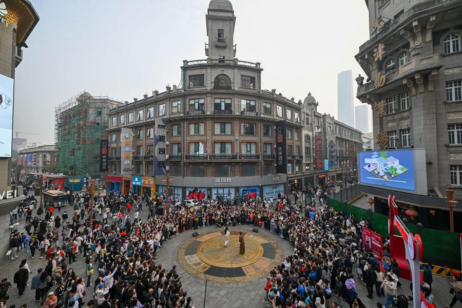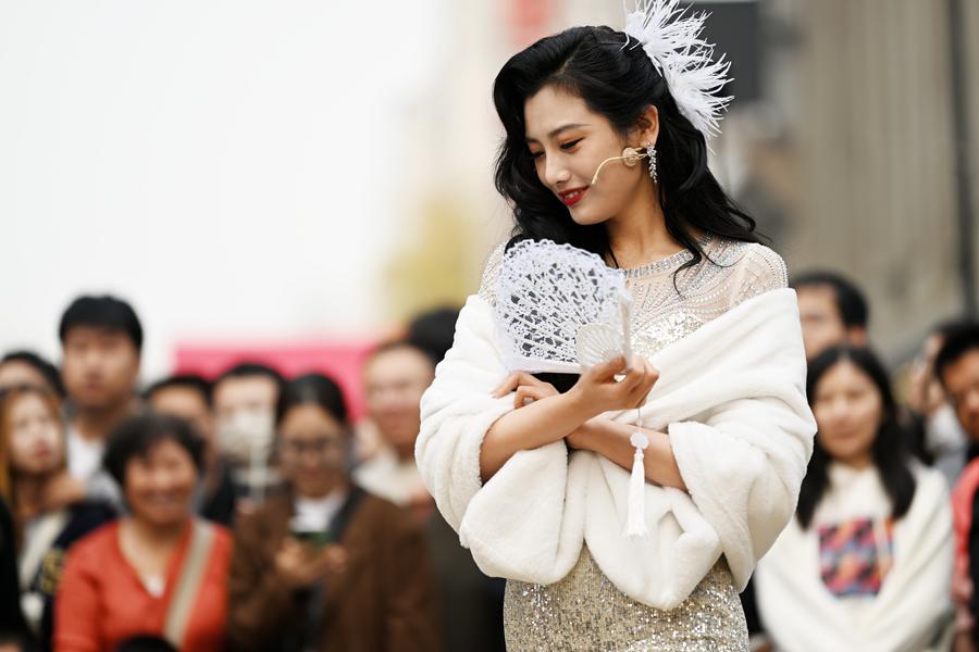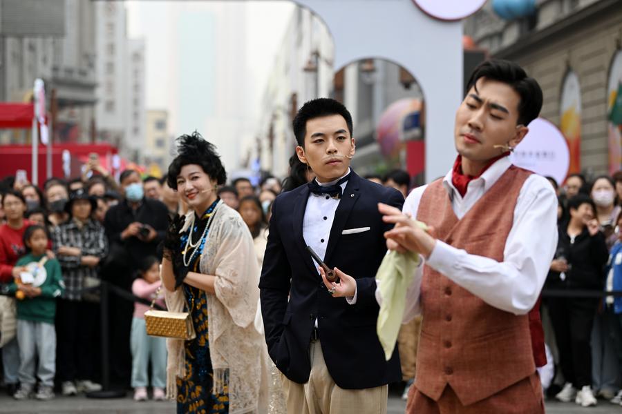 TIANJIN, April 15 (Xinhua) -- In the bustling heart of the historic Jinjie commercial district in Tianjin, a northern Chinese port city, the rhythmic clatter of a rickshaw and the elegant swish of a qipao-clad socialite's fan whisked the audience away to the ambiance of 1930s China.