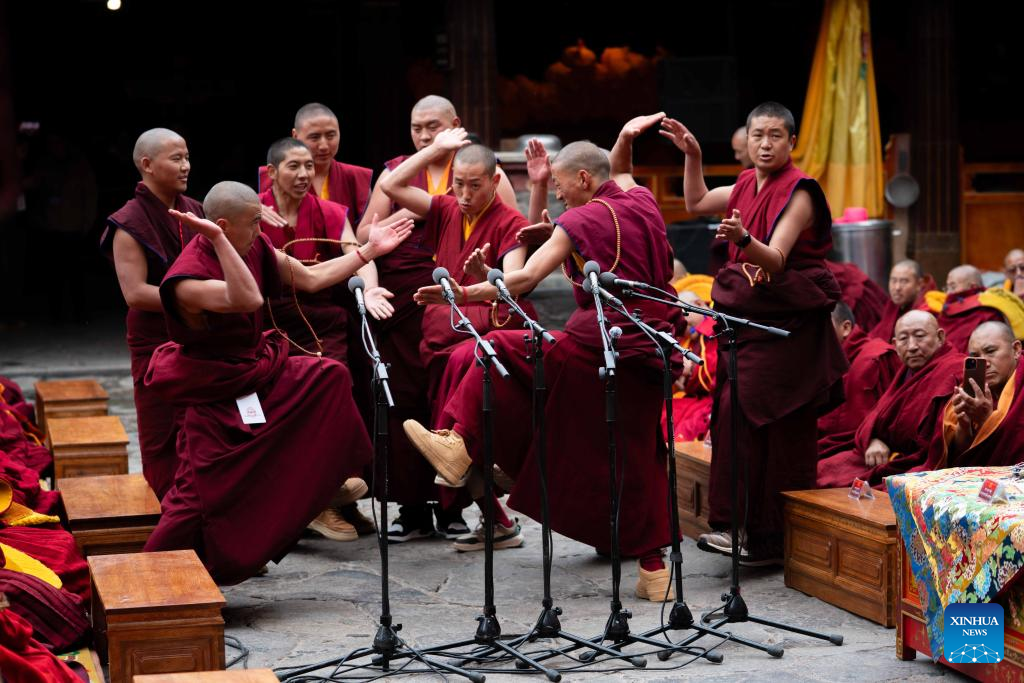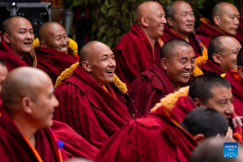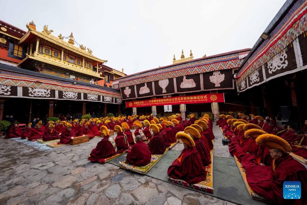 Monks attend a debate and award ceremony conferring the title of Geshe Lharampa at the Jokhang Temple in Lhasa, capital of southwest China's Xizang Autonomous Region, April 15, 2025. Thirteen monks obtained the degree of Geshe Lharampa, the highest academic degree in the exoteric teachings of the Gelug school of Tibetan Buddhism, here on Tuesday. Geshe Lharampa, which means "intellectual" in the Tibetan language, is the equivalent of a doctoral degree in modern education. (Xinhua/Tenzing Nima Qadhup)