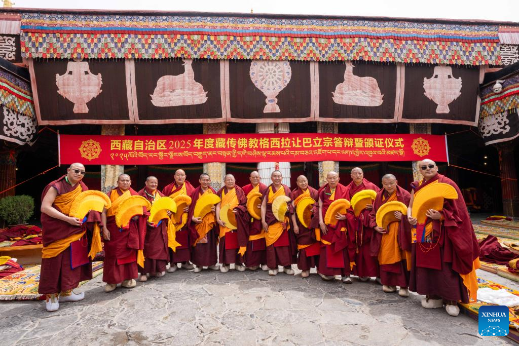 Monks pose for group photos during a debate and award ceremony conferring the title of Geshe Lharampa at the Jokhang Temple in Lhasa, capital of southwest China's Xizang Autonomous Region, April 15, 2025. Thirteen monks obtained the degree of Geshe Lharampa, the highest academic degree in the exoteric teachings of the Gelug school of Tibetan Buddhism, here on Tuesday. Geshe Lharampa, which means "intellectual" in the Tibetan language, is the equivalent of a doctoral degree in modern education. (Xinhua/Tenzing Nima Qadhup)