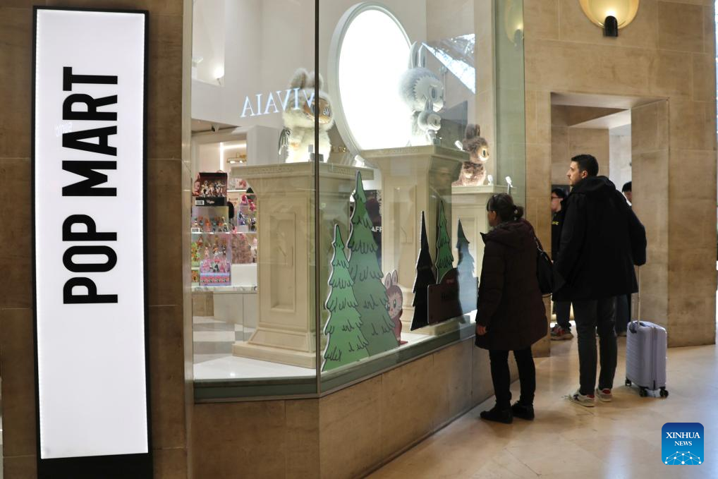 People linger around a POP MART store, a Chinese pop culture brand, near Louvre Museum in Paris, France, on March 18, 2025. (Xinhua/Zhang Baihui)