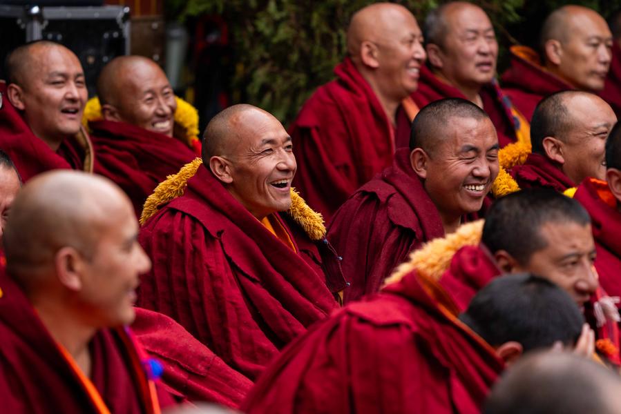 Monks pose for group photos during a debate and award ceremony conferring the title of Geshe Lharampa at the Jokhang Temple in Lhasa, capital of southwest China's Xizang Autonomous Region, April 15, 2025. (Xinhua/Tenzing Nima Qadhup)