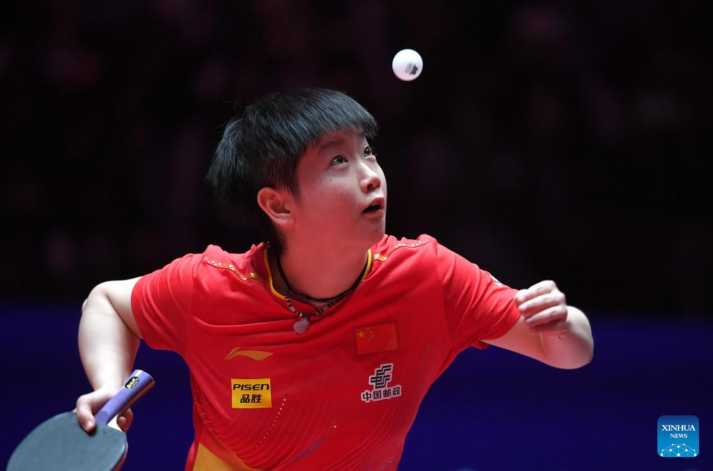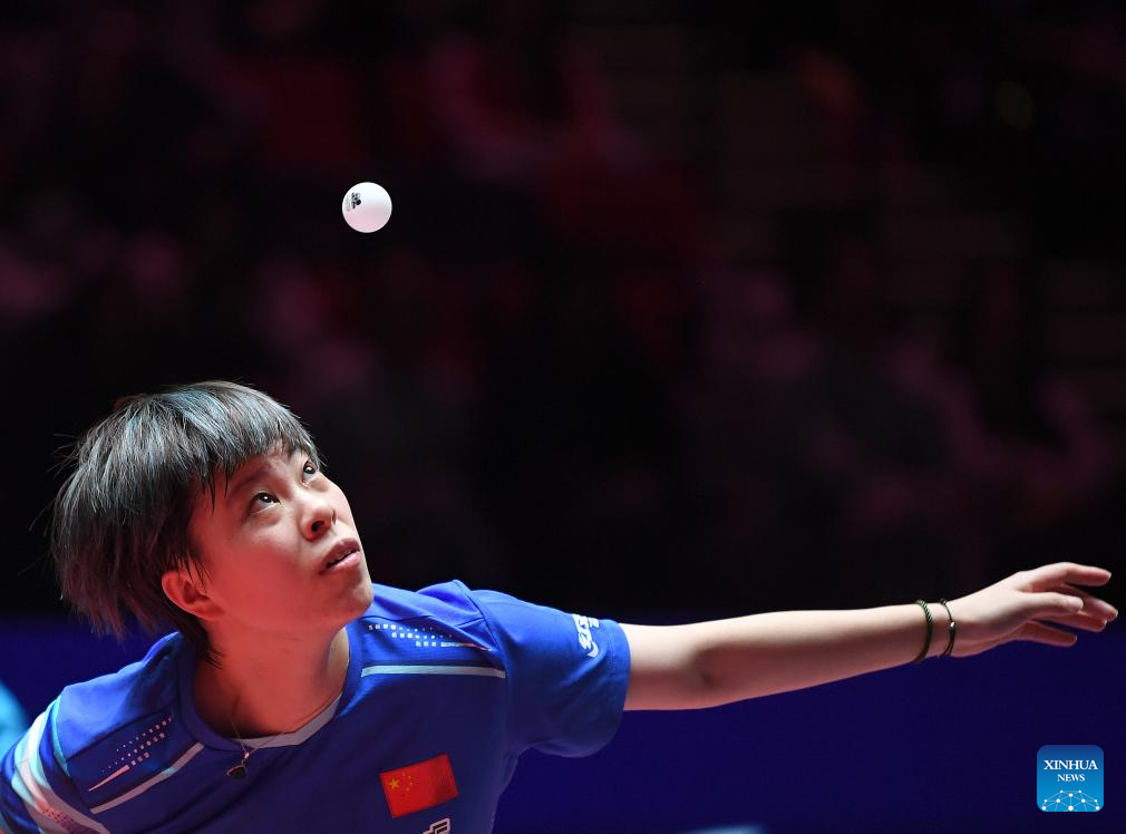 Kuai Man hits a return during the women's singles group match between Kuai Man of China and Dina Meshref of Egypt at the ITTF Men's and Women's World Cup 2025 in Macao, China, April 16, 2025. (Xinhua/Chen Duo)