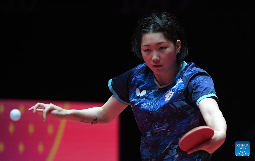 Chien Tung-Chuan hits a return during the women's singles group match between Sun Yingsha of China and Chien Tung-Chuan of Chinese Taipei at the ITTF Men's and Women's World Cup 2025 in Macao, China, April 16, 2025. (Xinhua/Chen Duo)