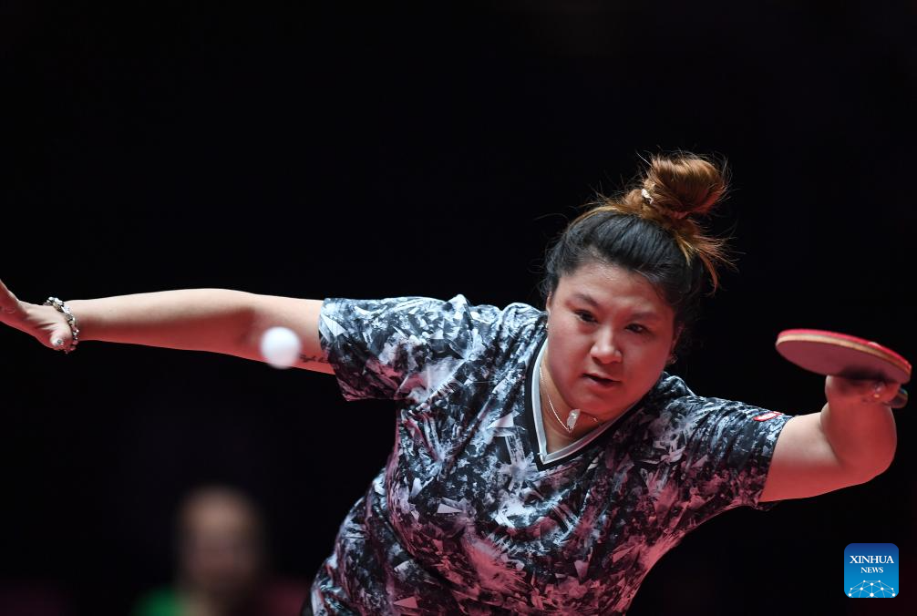 Dina Meshref hits a return during the women's singles group match between Kuai Man of China and Dina Meshref of Egypt at the ITTF Men's and Women's World Cup 2025 in Macao, China, April 16, 2025. (Xinhua/Chen Duo)