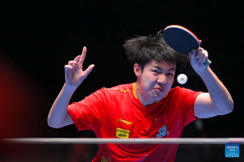 Liang Jingkun hits a return during the men's singles group match between Liang Jingkun of China and Nicholas Lum of Australia at the ITTF Men's and Women's World Cup 2025 in Macao, China, April 16, 2025. (Xinhua/Cheong Kam Ka)