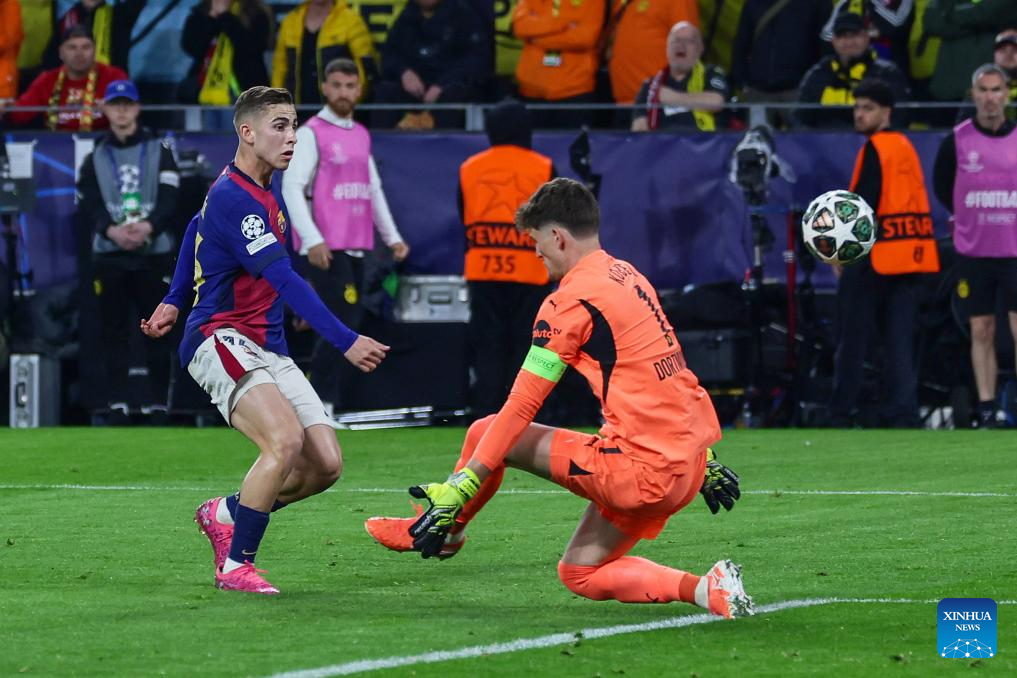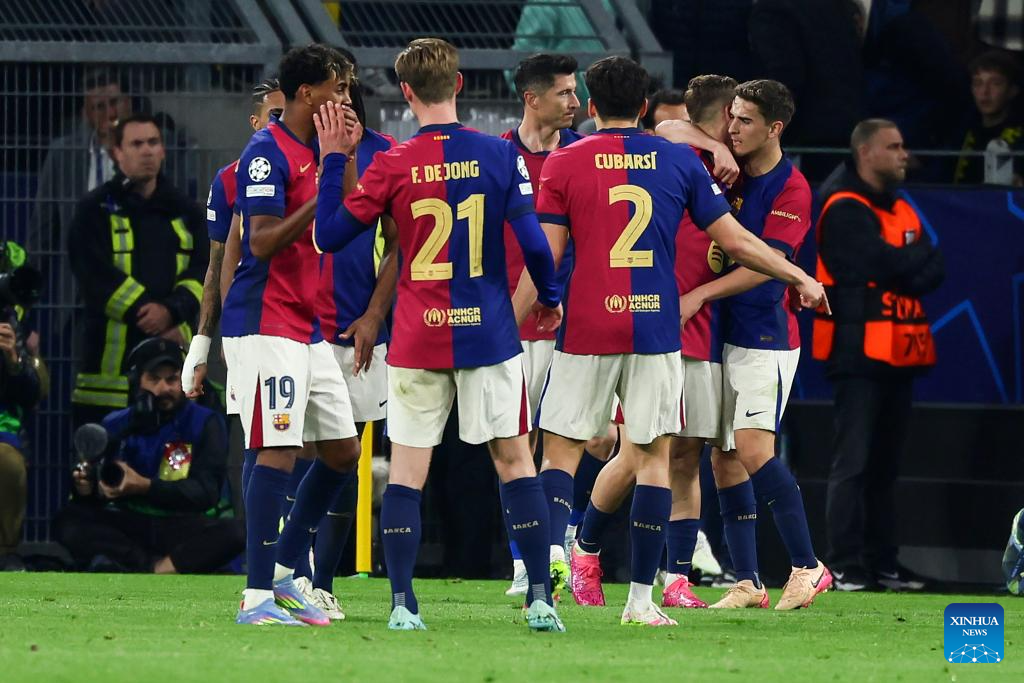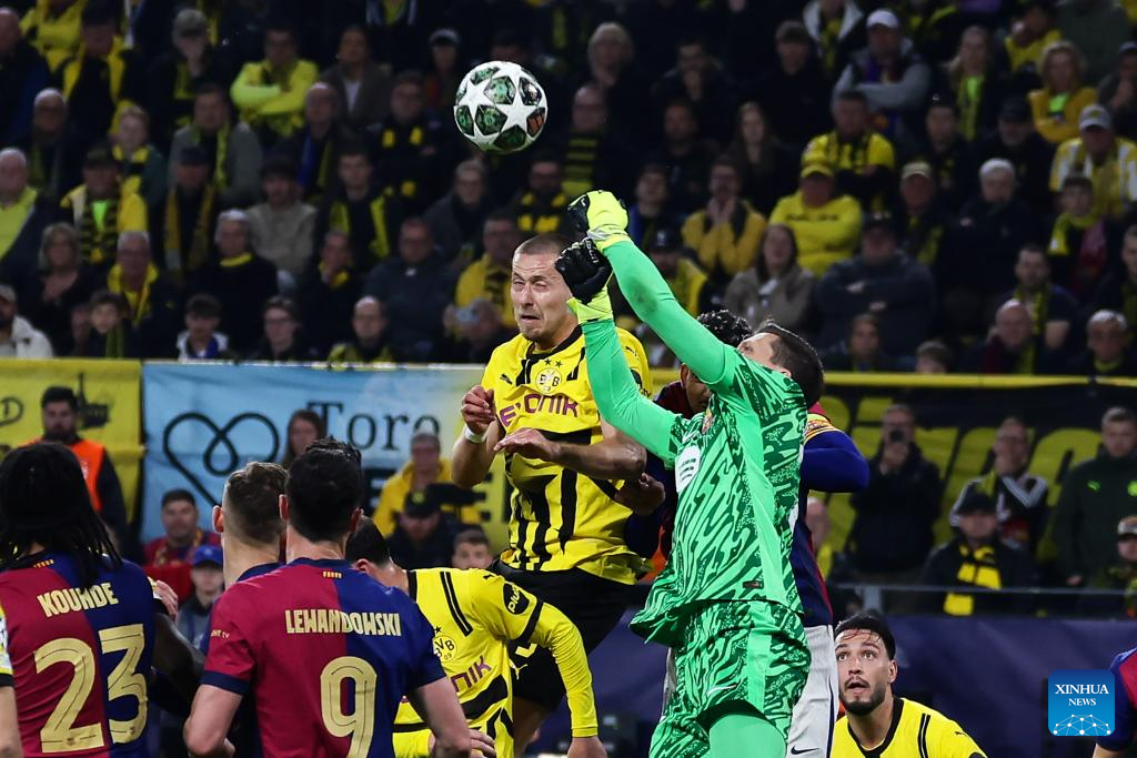 BERLIN, April 15 (Xinhua) -- Serhou Guirassy scored a stunning hat-trick, but Borussia Dortmund was knocked out of the UEFA Champions League by Barcelona on Wednesday night, despite a spirited 3-1 win in the quarterfinal second leg.