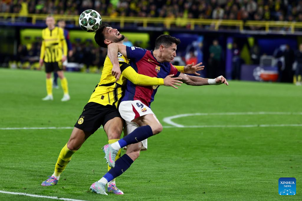 Ramy Bensebaini (L) of Borussia Dortmund and Robert Lewandowski of FC Barcelona head for the ball during the UEFA Champions League quarterfinal 2nd leg football match between Borussia Dortmund and FC Barcelona in Dortmund, Germany, April 15, 2025. (Photo by Joachim Bywaletz/Xinhua)