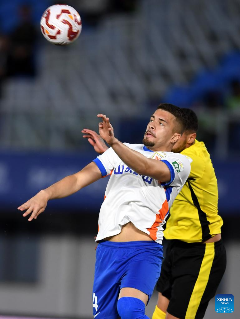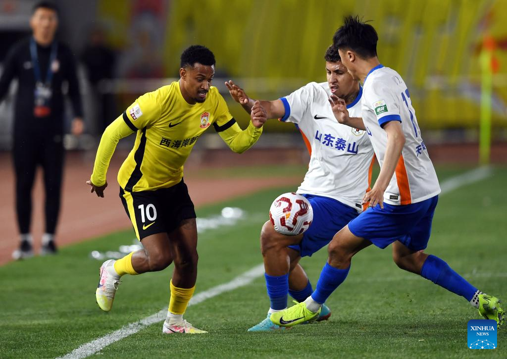 Lucas Xavier Gazal (front) of Shandong Taishan competes during the 7th round match between Qingdao West Coast and Shandong Taishan at the 2025 Chinese Super League (CSL) in Qingdao, east China's Shandong Province, April 15, 2025. (Xinhua/Li Ziheng)