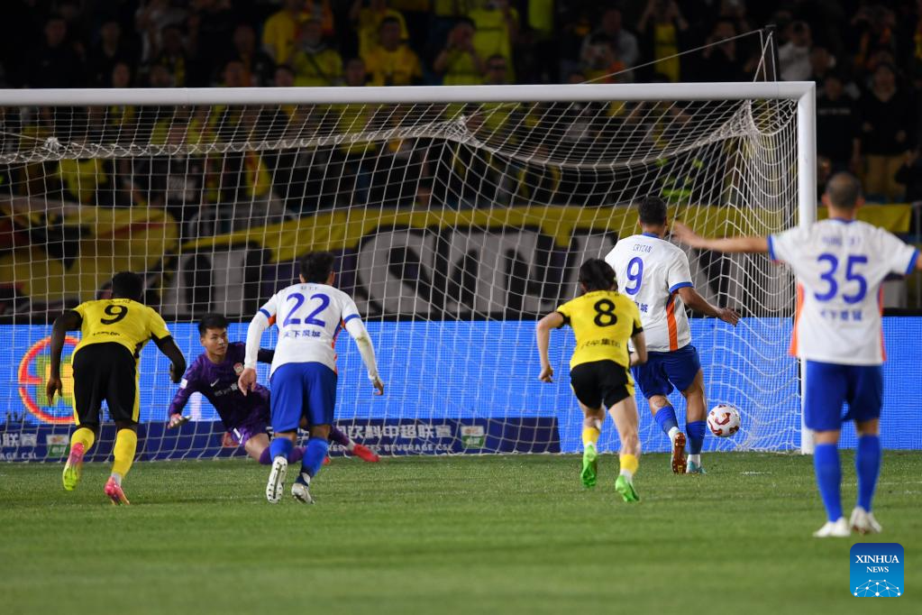 Cryzan Barcelos (2nd R) of Shandong Taishan scores a penalty during the 7th round match between Qingdao West Coast and Shandong Taishan at the 2025 Chinese Super League (CSL) in Qingdao, east China's Shandong Province, April 15, 2025. (Xinhua/Li Ziheng)