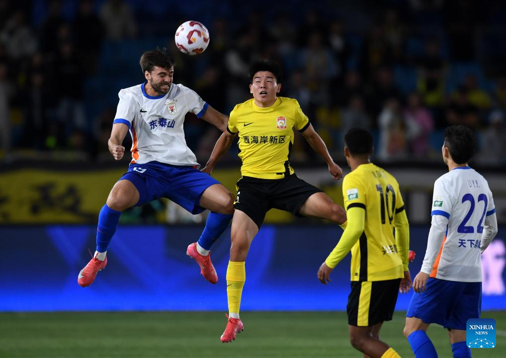 Zeca (1st L) of Shandong Taishan vies with Davidson (top) of Qingdao West Coast during the 7th round match between Qingdao West Coast and Shandong Taishan at the 2025 Chinese Super League (CSL) in Qingdao, east China's Shandong Province, April 15, 2025. (Xinhua/Li Ziheng)