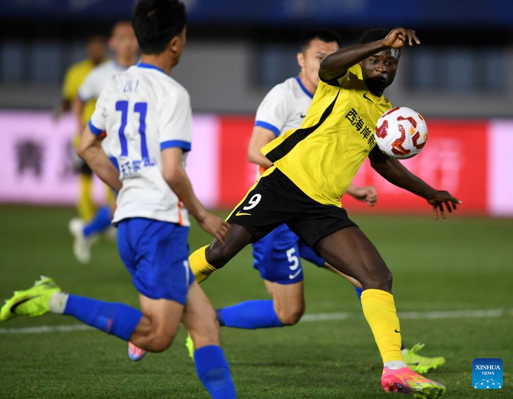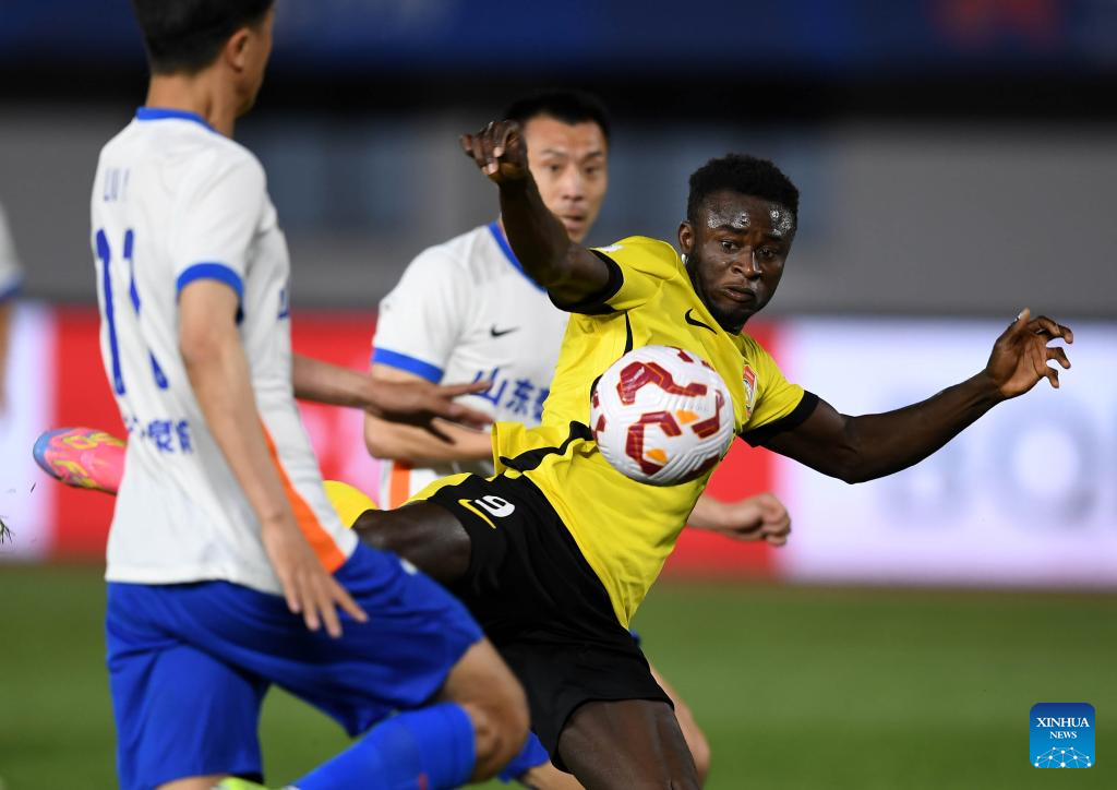 Aziz Yakubu (R) of Qingdao West Coast shoots during the 7th round match between Qingdao West Coast and Shandong Taishan at the 2025 Chinese Super League (CSL) in Qingdao, east China's Shandong Province, April 15, 2025. (Xinhua/Li Ziheng)