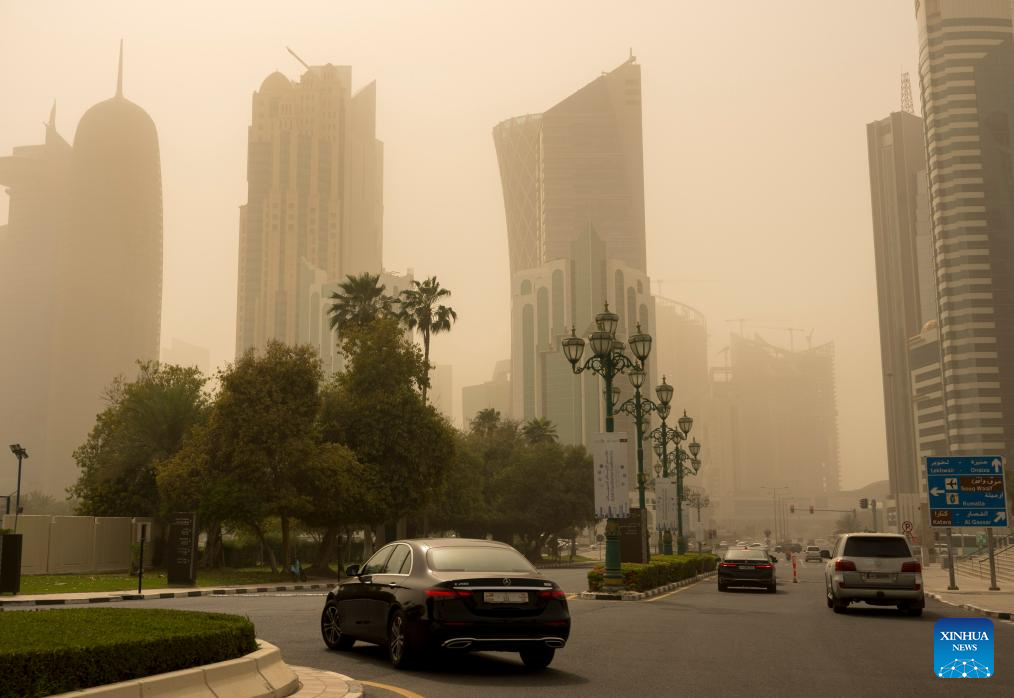 Vehicles pass in dense dust in Doha, Qatar, April 15, 2025. A sandstorm hit Doha on Tuesday. (Photo by Nikku/Xinhua)