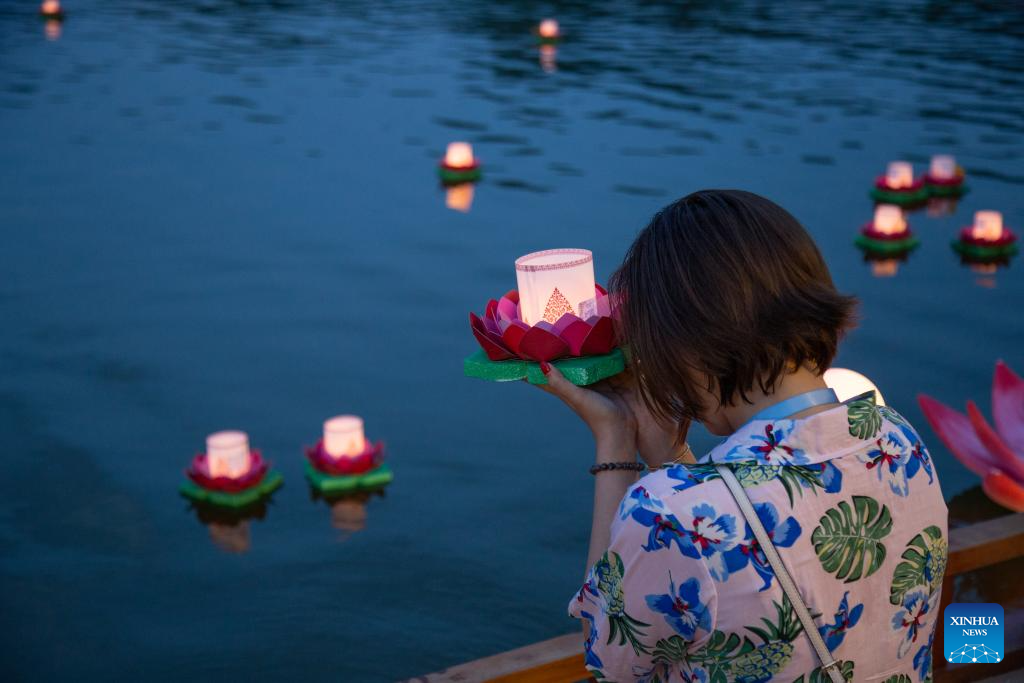 A woman prays before releasing a water lantern in a moat in front of the Angkor Wat in Siem Reap province, Cambodia, April 15, 2025. Cambodia celebrated its three-day Lunar New Year from April 14 to 16 this year. (Photo by Sao Khuth/Xinhua)