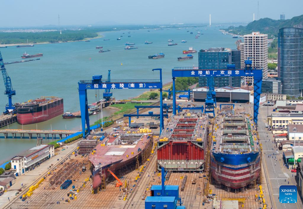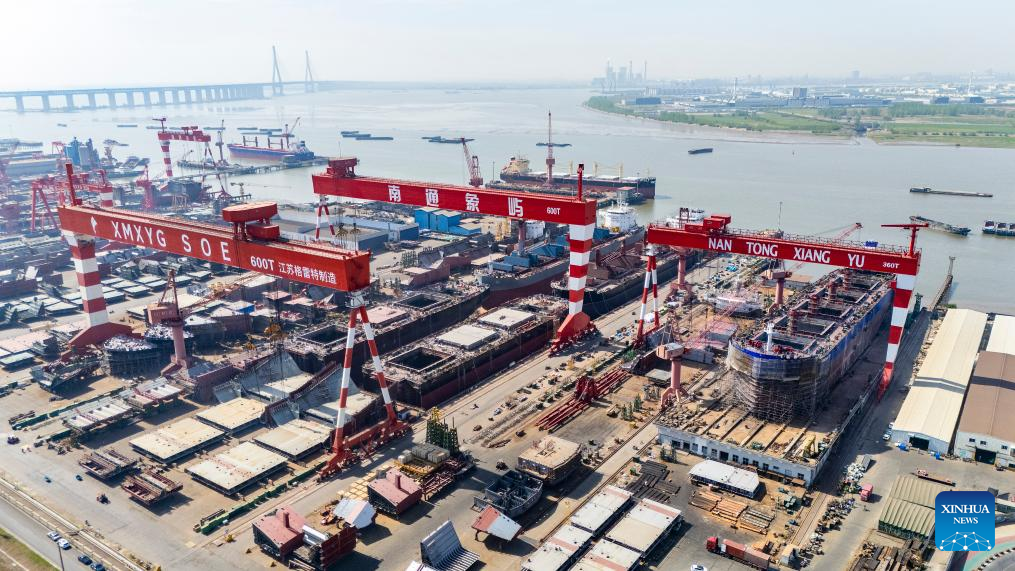 This aerial drone photo shows a view of a shipyard of Nantong Xiangyu Shipbuilding & Offshore Engineering Co., Ltd. in Nantong, east China's Jiangsu Province, April 16, 2025.