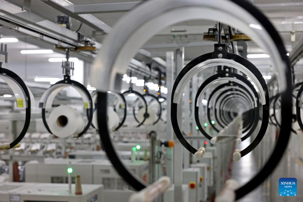 This photo shows a view of an intelligent spinnery in Zaozhuang City, east China's Shandong Province, April 15, 2025. China's gross domestic product (GDP) grew 5.4 percent year on year in the first quarter of 2025, data from the National Bureau of Statistics (NBS) showed Wednesday. The country's GDP reached 31.8758 trillion yuan (about 4.42 trillion U.S. dollars) during this period, the NBS data showed. On a quarterly basis, the economy increased 1.2 percent in the first three months. (Photo by Sun Zhongzhe/Xinhua)