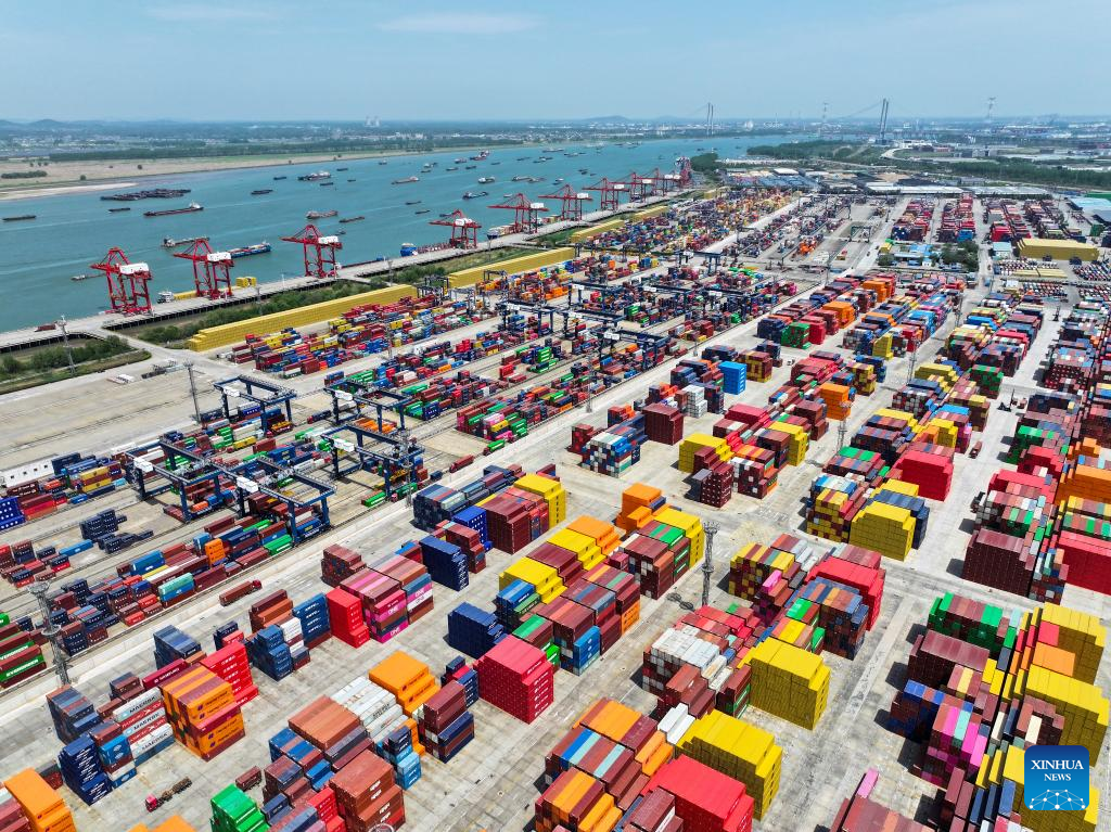 This aerial drone photo shows a view of the container terminal of Nanjing Port in east China's Jiangsu Province, April 16, 2025.