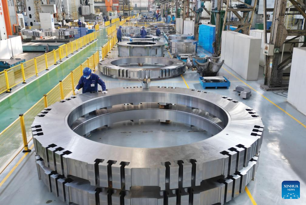 In this aerial drone photo, staff work at a factory of Harbin Electric Machinery Company Limited under Harbin Electric Corporation in Harbin, northeast China's Heilongjiang Province, April 16, 2025.