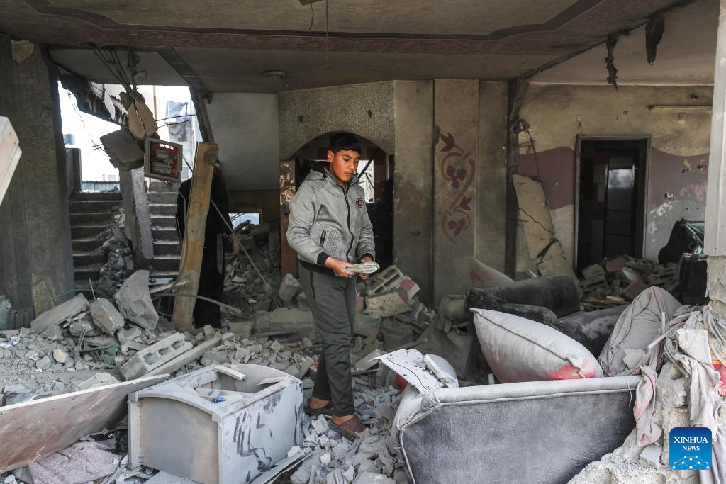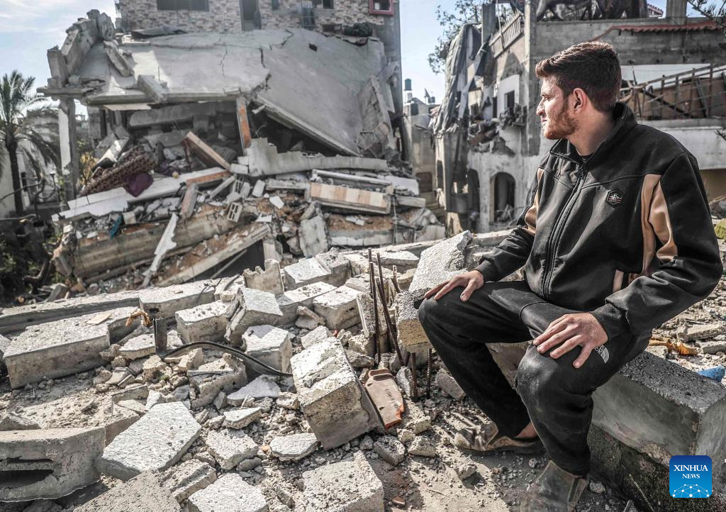 A Palestinian young man inspects a destroyed house after an Israeli airstrike in Jabalia refugee camp, northern Gaza Strip, on April 16, 2025. (Photo by Mahmoud Zaki/Xinhua)