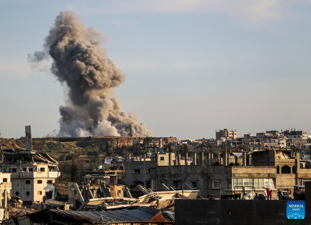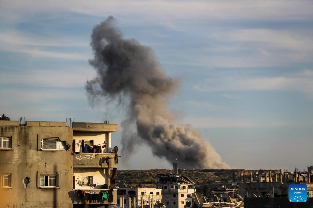 Smoke rises following an Israeli airstrike in Gaza City, April 15, 2025. (Photo by Mahmoud Zaki/Xinhua)