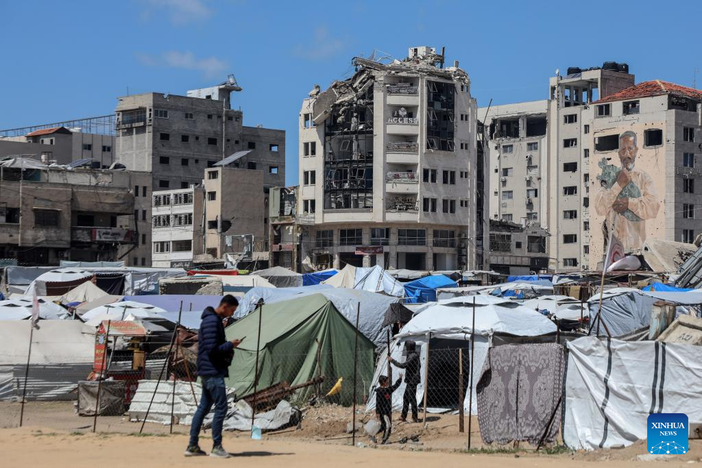 This photo taken on April 15, 2025 shows tents at a temporary shelter in Gaza City. (Photo by Rizek Abdeljawad/Xinhua)