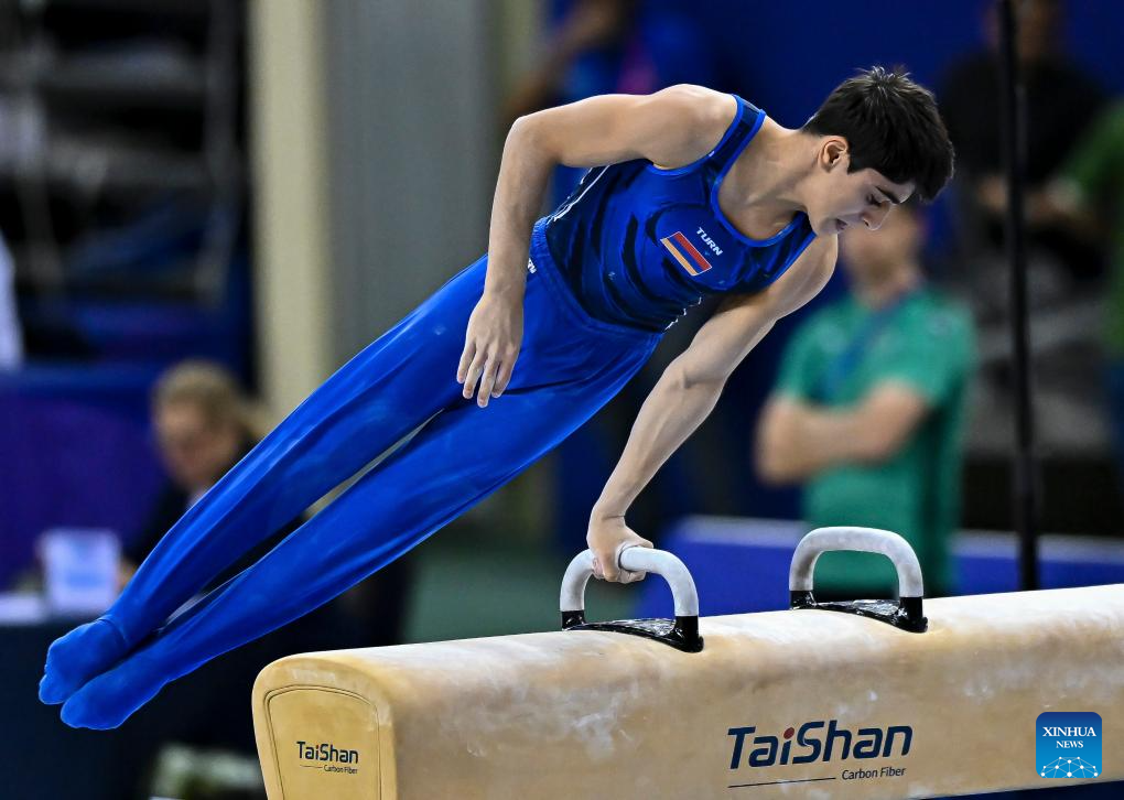 Hamlet Manukyan of Armenia competes during the men's Pommel Horse qualifying round of the 17th FIG Artistic Gymnastics Apparatus World Cup in Doha, Qatar, April 16, 2025. (Photo by Nikku/Xinhua)