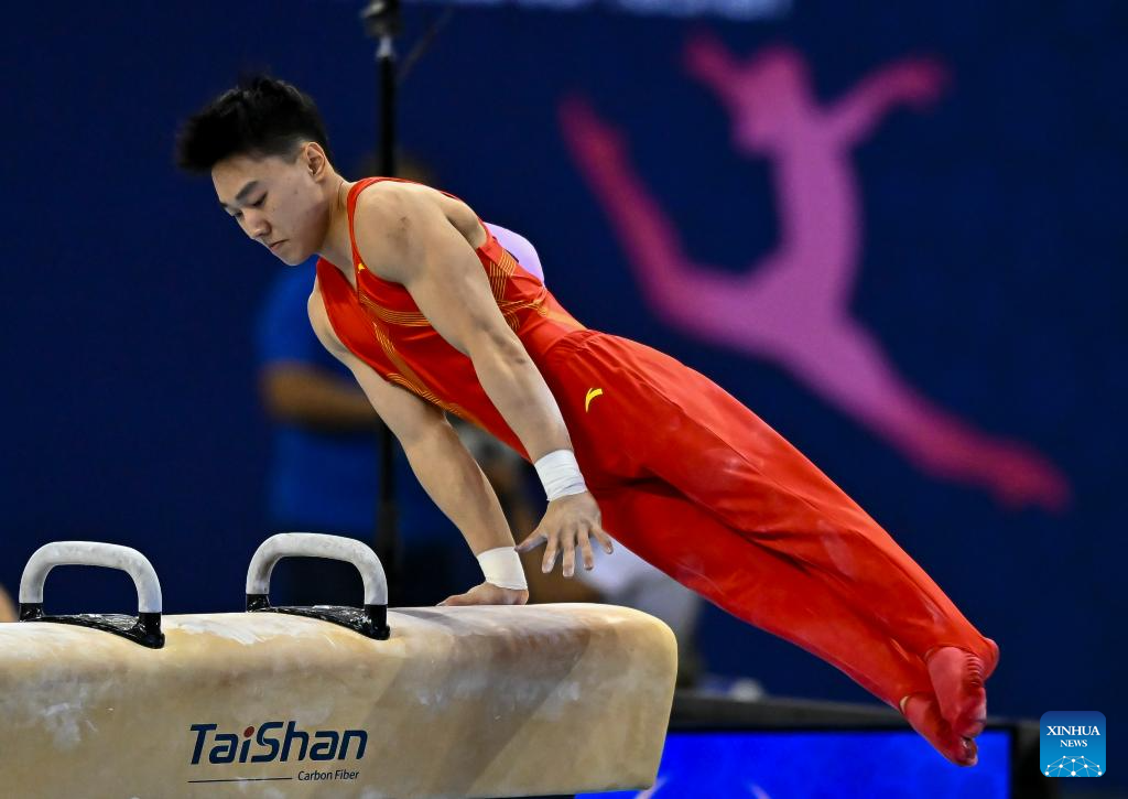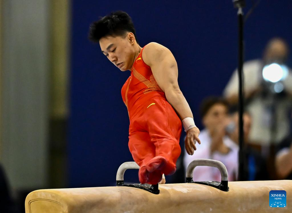 Hong Yanming of China competes during the men's Pommel Horse qualifying round of the 17th FIG Artistic Gymnastics Apparatus World Cup in Doha, Qatar, April 16, 2025. (Photo by Nikku/Xinhua)