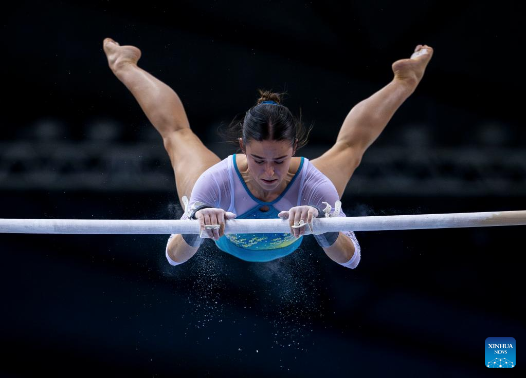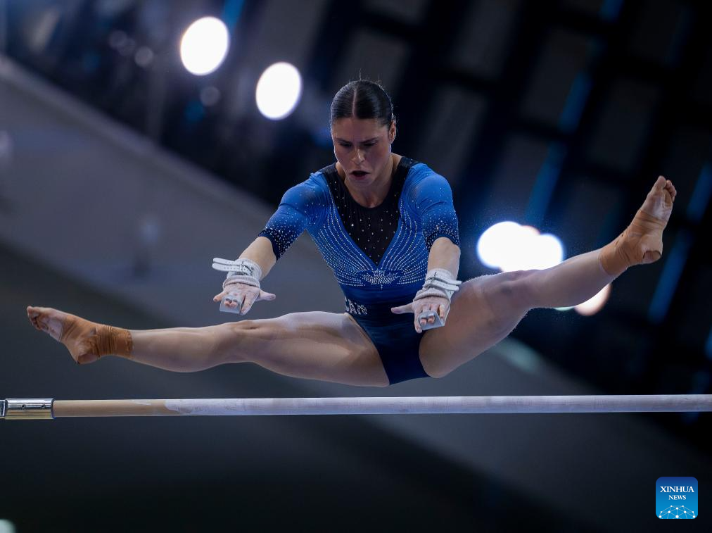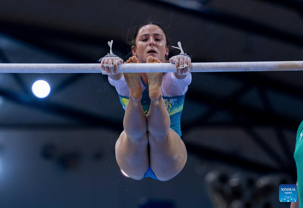 Kate Mcdonald of Australia competes during the women's Uneven Bars qualifying round of the 17th FIG Artistic Gymnastics Apparatus World Cup in Doha, Qatar, April 16, 2025. (Photo by Nikku/Xinhua)
