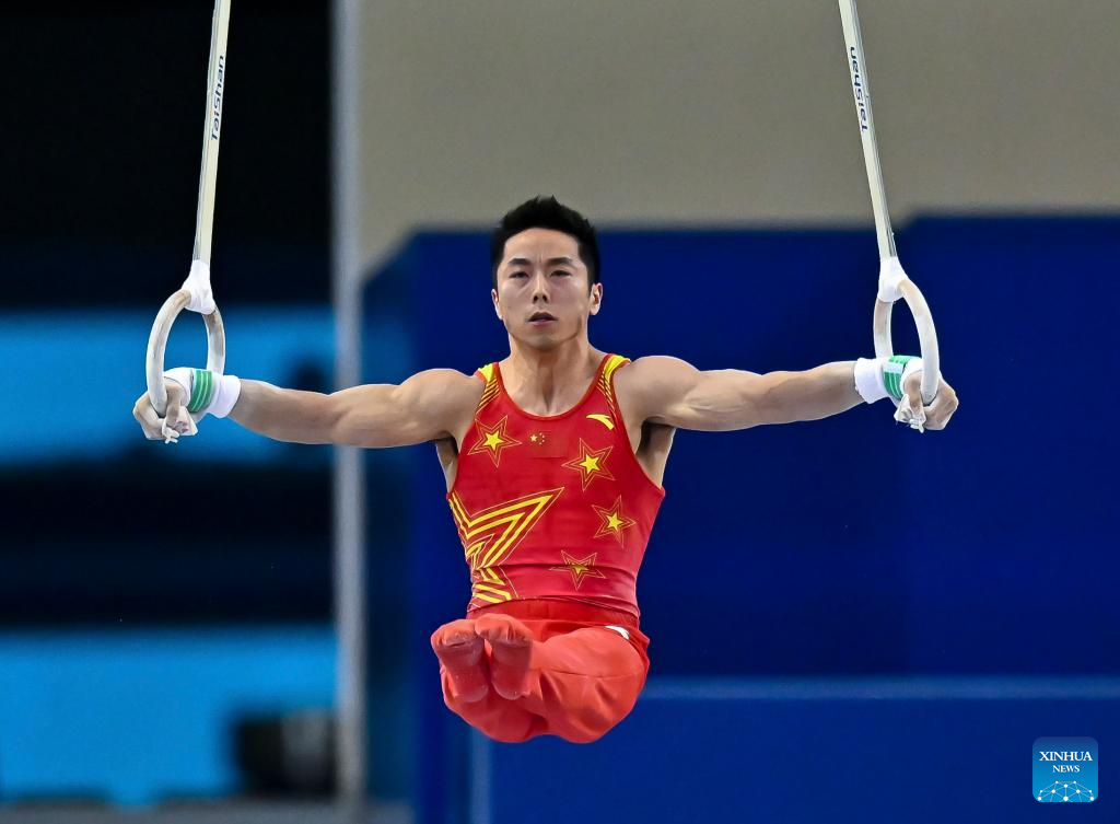 You Hao of China competes during the men's Still Rings qualifying round of the 17th FIG Artistic Gymnastics Apparatus World Cup in Doha, Qatar, April 16, 2025. (Photo by Nikku/Xinhua)