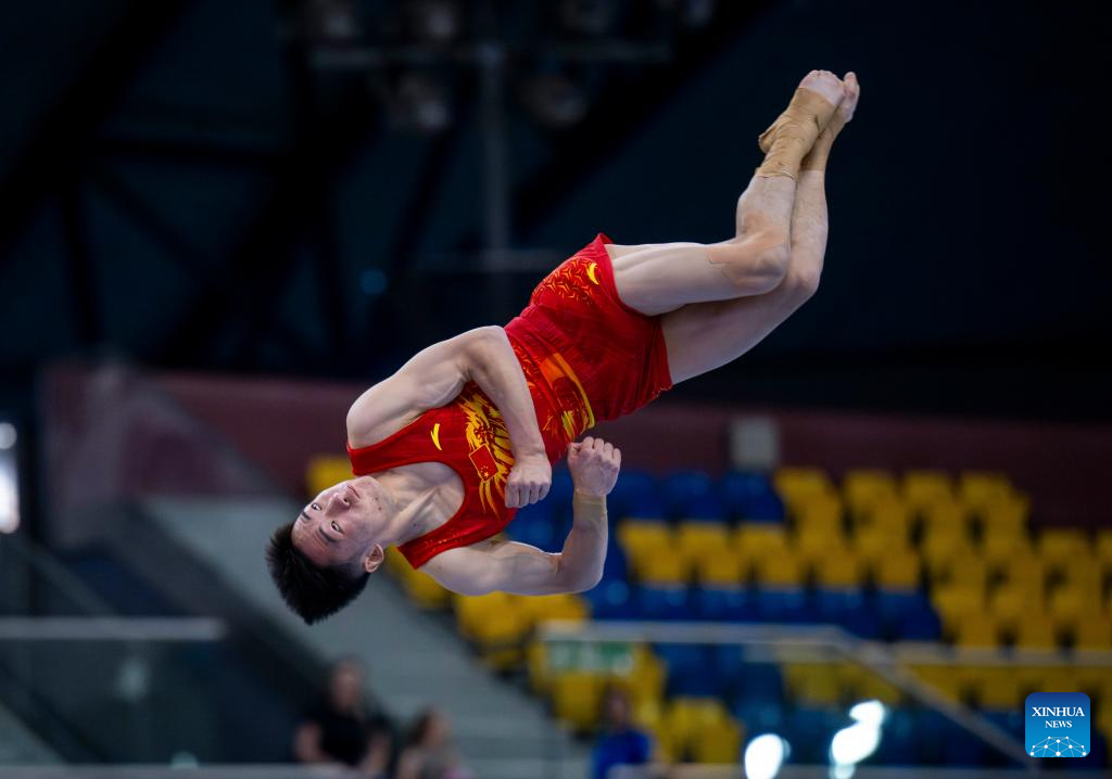 Tang Qi of China competes during the men's Floor Exercise qualifying round of the 17th FIG Artistic Gymnastics Apparatus World Cup in Doha, Qatar, April 16, 2025. (Photo by Nikku/Xinhua)