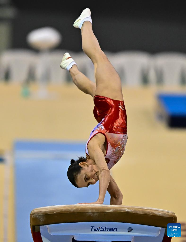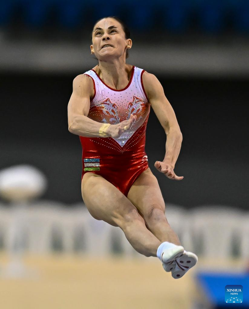 Oksana Chusovitina of Uzbekistan competes during the women's Vault qualifying round of the 17th FIG Artistic Gymnastics Apparatus World Cup in Doha, Qatar, April 16, 2025. (Photo by Nikku/Xinhua)