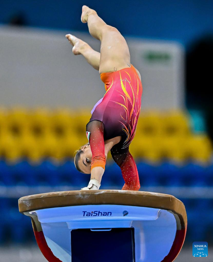 Greta Mayer of Hungary competes during the women's Vault qualifying round of the 17th FIG Artistic Gymnastics Apparatus World Cup in Doha, Qatar, April 16, 2025. (Photo by Nikku/Xinhua)