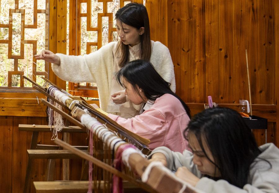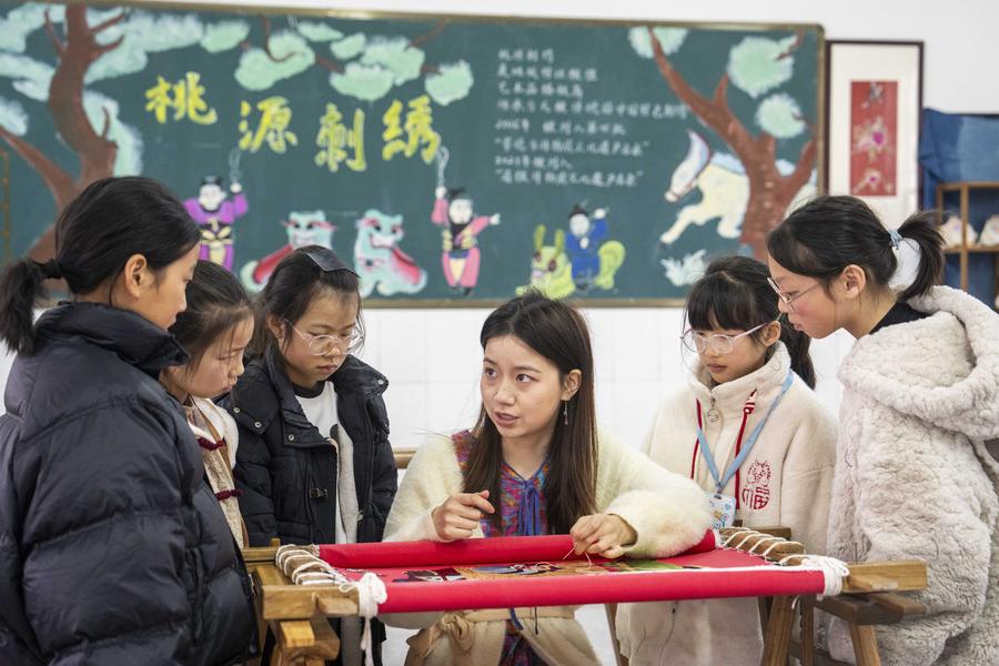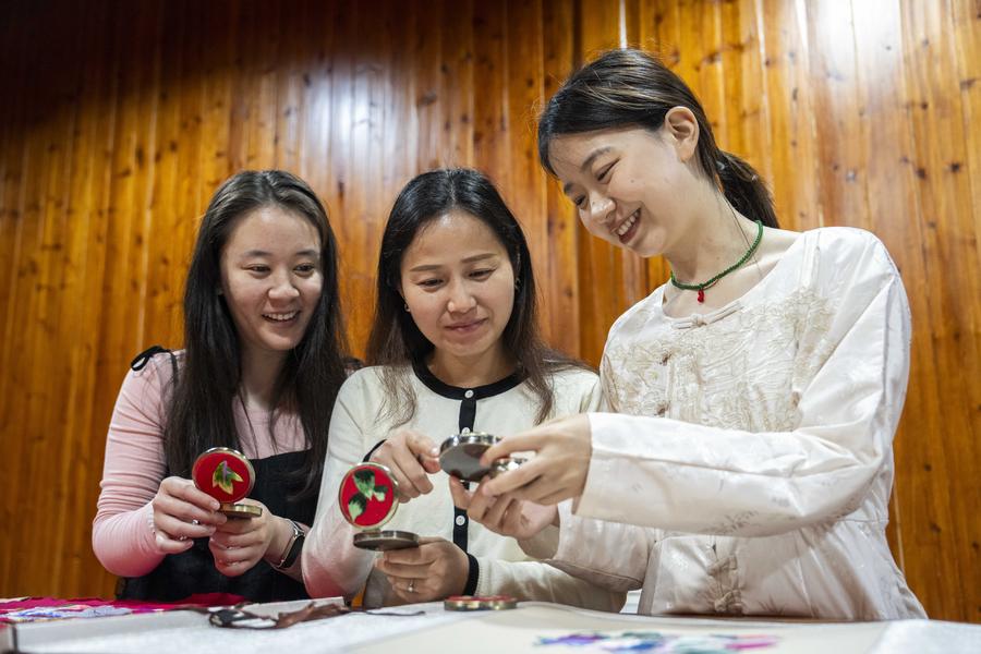 Xiao Yao (R) introduces a foldable mirror with elements of Taoyuan Embroidery at her workshop in Lizigang Village of Taoyuan County, central China's Hunan Province, April 16, 2025. (Xinhua/Chen Sihan)Xiao Yao compiles a stitch manual of Taoyuan Embroidery at her workshop in Lizigang Village of Taoyuan County, central China's Hunan Province, April 15, 2025.(Xinhua/Chen Sihan)Xiao Yao (C) introduces embroidery works to tourists at her workshop in Lizigang Village of Taoyuan County, central China's Hunan Province, April 16, 2025. (Xinhua/Chen Sihan)Xiao Yao (3rd R) introduces embroidery skill to students at a middle school in Taoyuan County, central China's Hunan Province, March 6, 2025. (Xinhua/Chen Sihan)Xiao Yao (back) discusses embroidery skill with colleagues at her workshop in Lizigang Village of Taoyuan County, central China's Hunan Province, April 17, 2025.(Xinhua/Chen Sihan)Xiao Yao makes Taoyuan Embroidery works at her workshop in Lizigang Village of Taoyuan County, central China's Hunan Province, April 16, 2025. (Xinhua/Chen Sihan)Xiao Yao works at her workshop in Lizigang Village of Taoyuan County, central China's Hunan Province, April 16, 2025. (Xinhua/Chen Sihan)Xiao Yao (2nd R) teaches embroidery skill to villagers at her workshop in Lizigang Village of Taoyuan County, central China's Hunan Province, April 17, 2025. (Xinhua/Chen Sihan)Xiao Yao promotes Taoyuan Embroidery via live-streaming at her workshop in Lizigang Village of Taoyuan County, central China's Hunan Province, April 15, 2025. (Xinhua/Chen Sihan)Xiao Yao makes Taoyuan Embroidery works at her workshop in Lizigang Village of Taoyuan County, central China's Hunan Province, April 16, 2025. (Xinhua/Chen Sihan)■