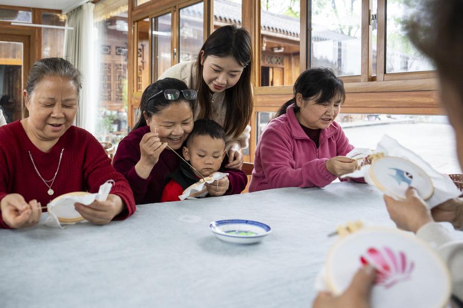 CHANGSHA, April 17 (Xinhua) -- Taoyuan Embroidery is a traditional craft with distinct local characteristics from Taoyuan County. Its origins can be traced back to the Xia (2070-1600 B.C.) and Shang (1600 BC-1046 BC) dynasties. Known for its vibrant colors and bold designs, Taoyuan Embroidery was listed as a provincial-level intangible cultural heritage in 2021.