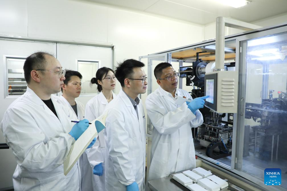 Researchers assemble pouch cells made of lithium-rich layered oxide cathode materials at the Ningbo Institute of Materials Technology and Engineering (NIMTE), Chinese Academy of Sciences (CAS), in Ningbo City, east China's Zhejiang Province, April 8, 2025. Scientists have identified materials that contract upon heating, which enables the rejuvenation of aging lithium-ion batteries with nearly 100 percent voltage recovery. (NIMTE/Handout via Xinhua)